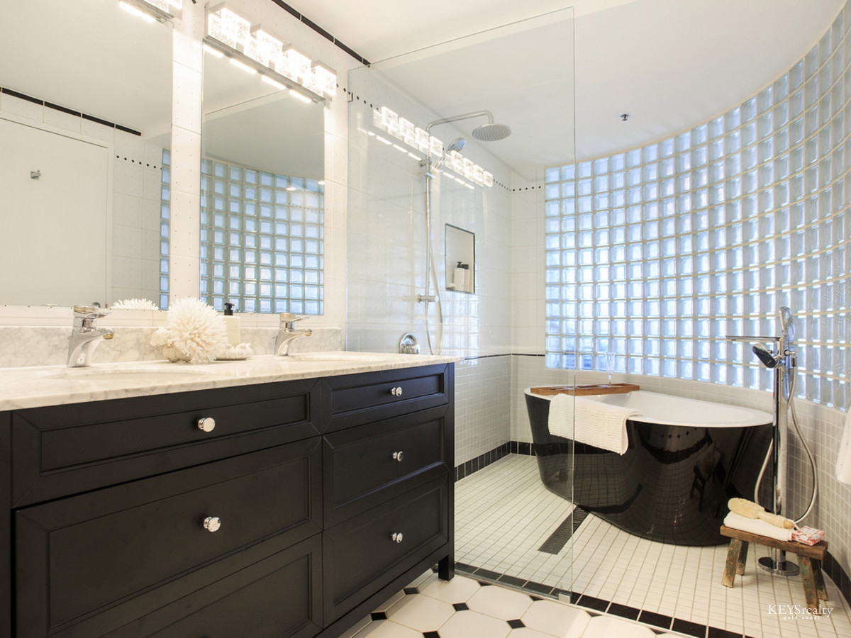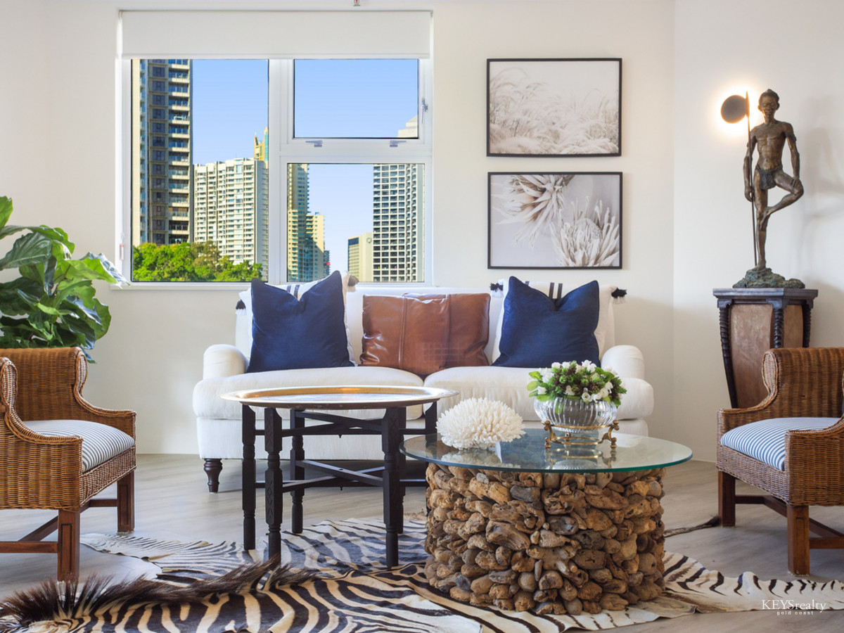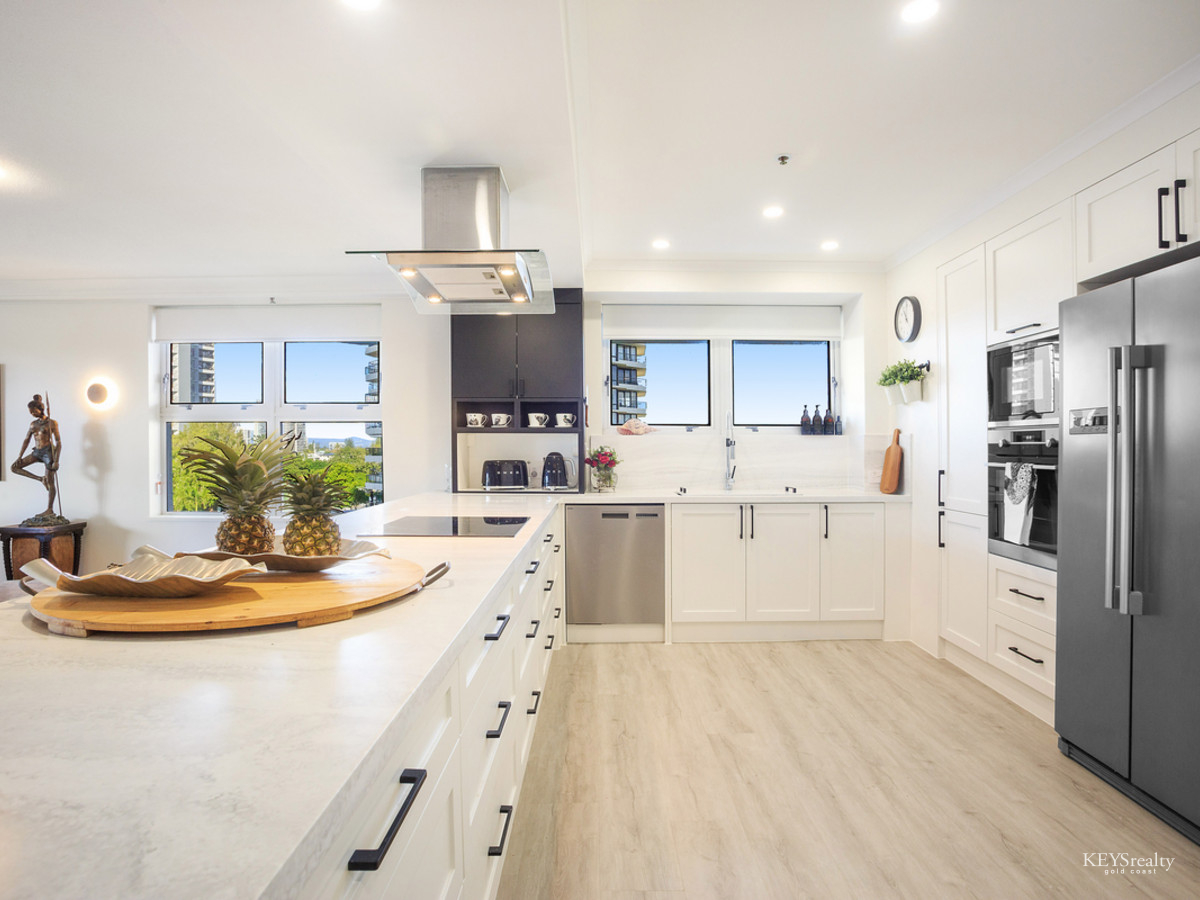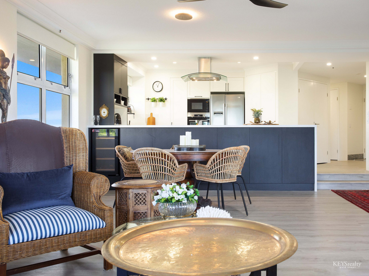This stunning oversized apartment has one of the best renovations we have seen. Situated on a lower level but still with a delightful tree top outlook, ocean glimpses and skyline views that look great at night.