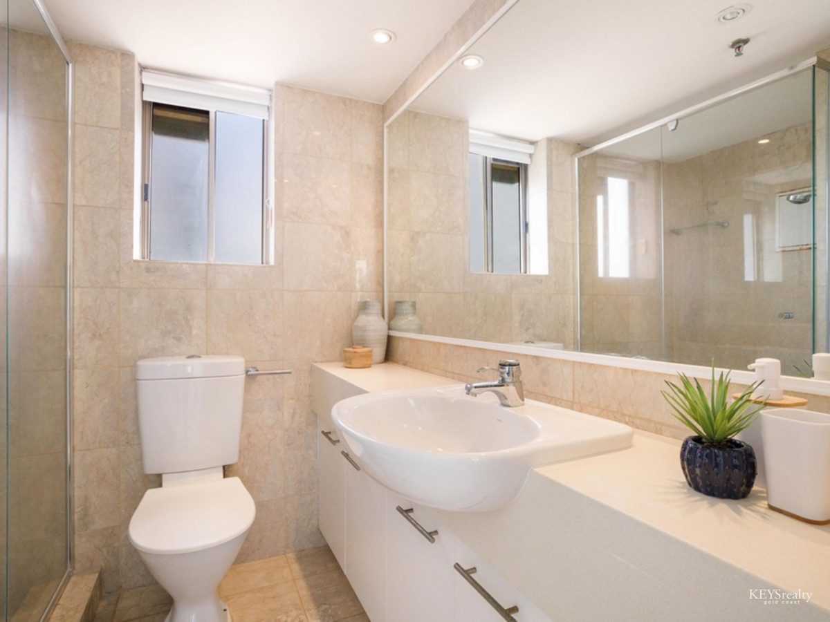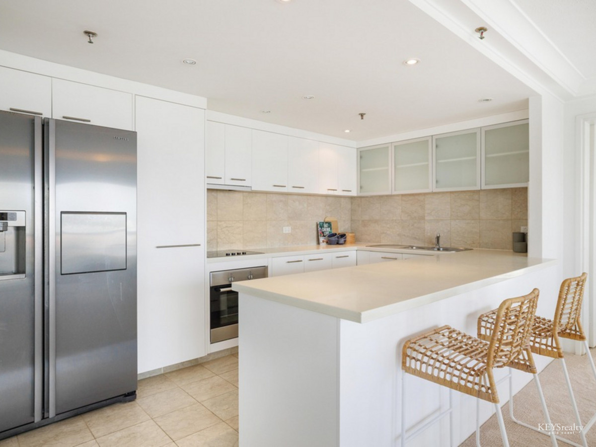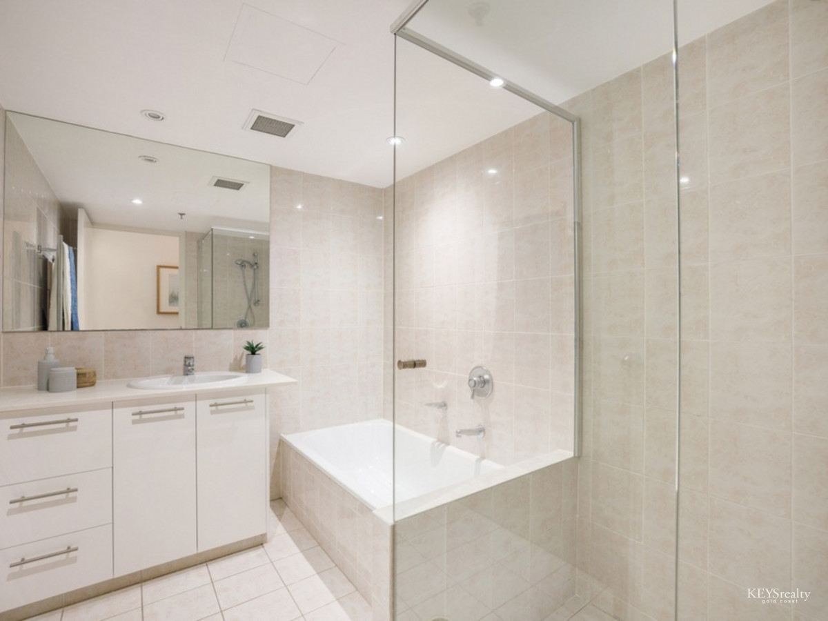 Imagine living in this large renovated mid-level Residential Only half-floor apartment a short stroll to the beach and Tedder Avenue Village! Entertainers delight with wide open plan living spaces and separate bed and bath wings all flowing out to spacious outdoor entertaining areas to enjoy the ocean and Broadwater views.