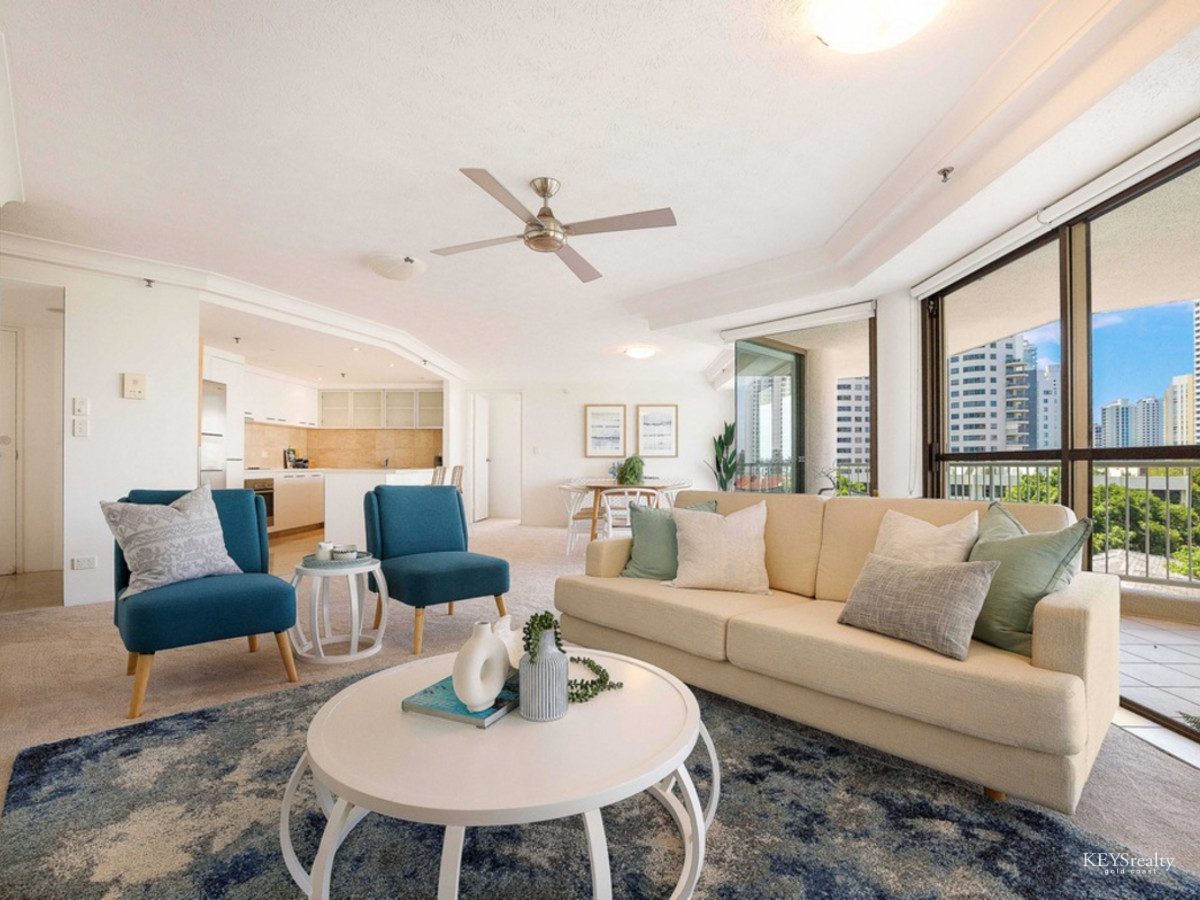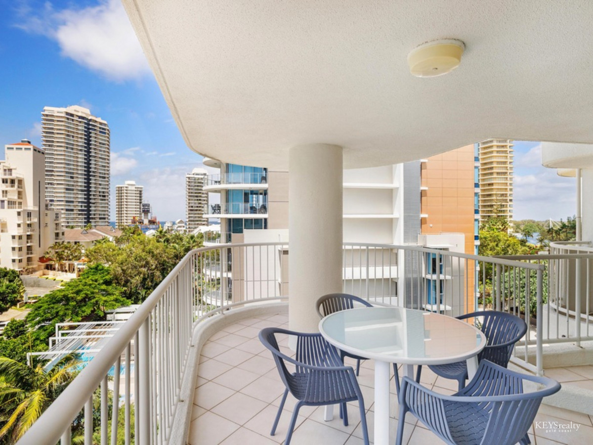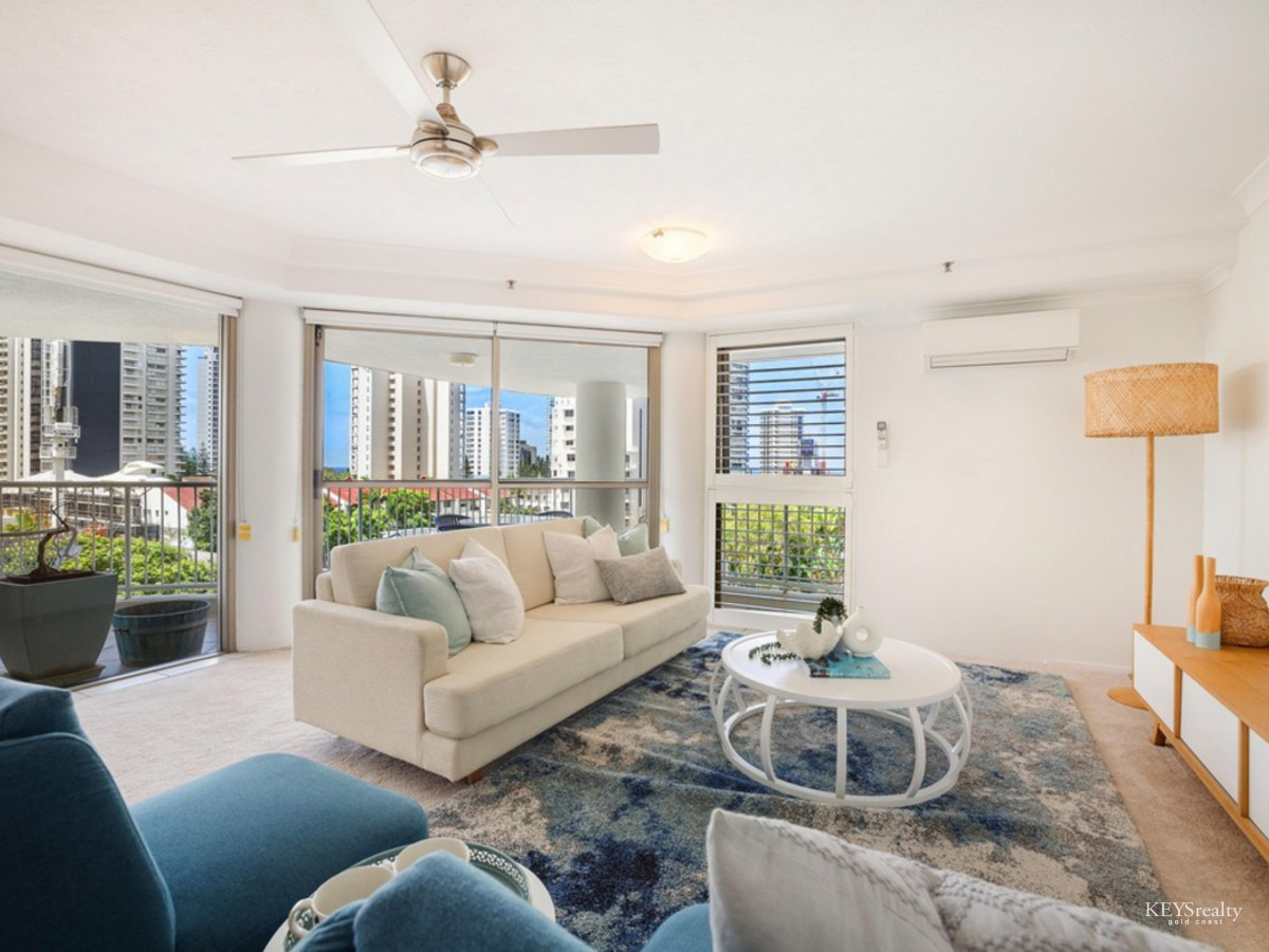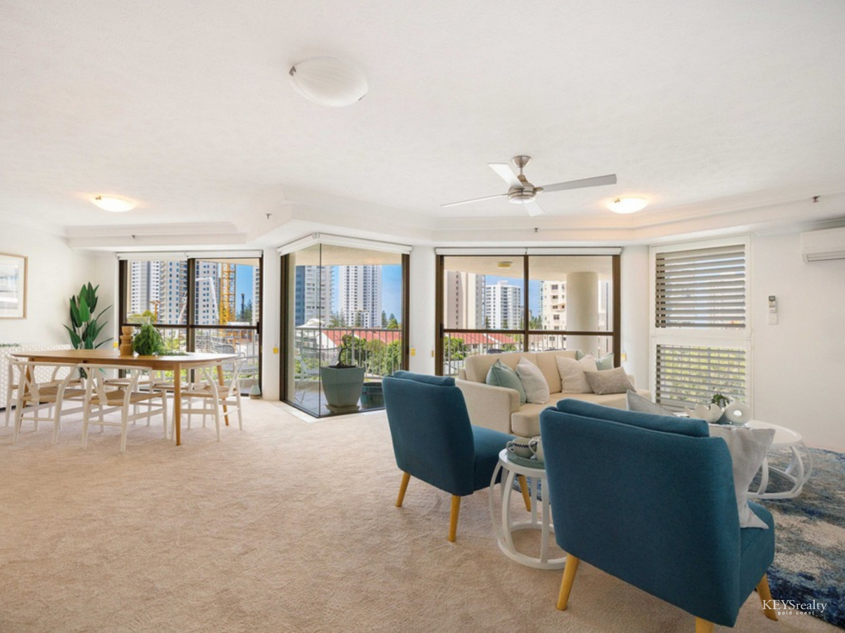 Imagine living in this large renovated mid-level Residential Only half-floor apartment a short stroll to the beach and Tedder Avenue Village! Entertainers delight with wide open plan living spaces and separate bed and bath wings all flowing out to spacious outdoor entertaining areas to enjoy the ocean and Broadwater views.