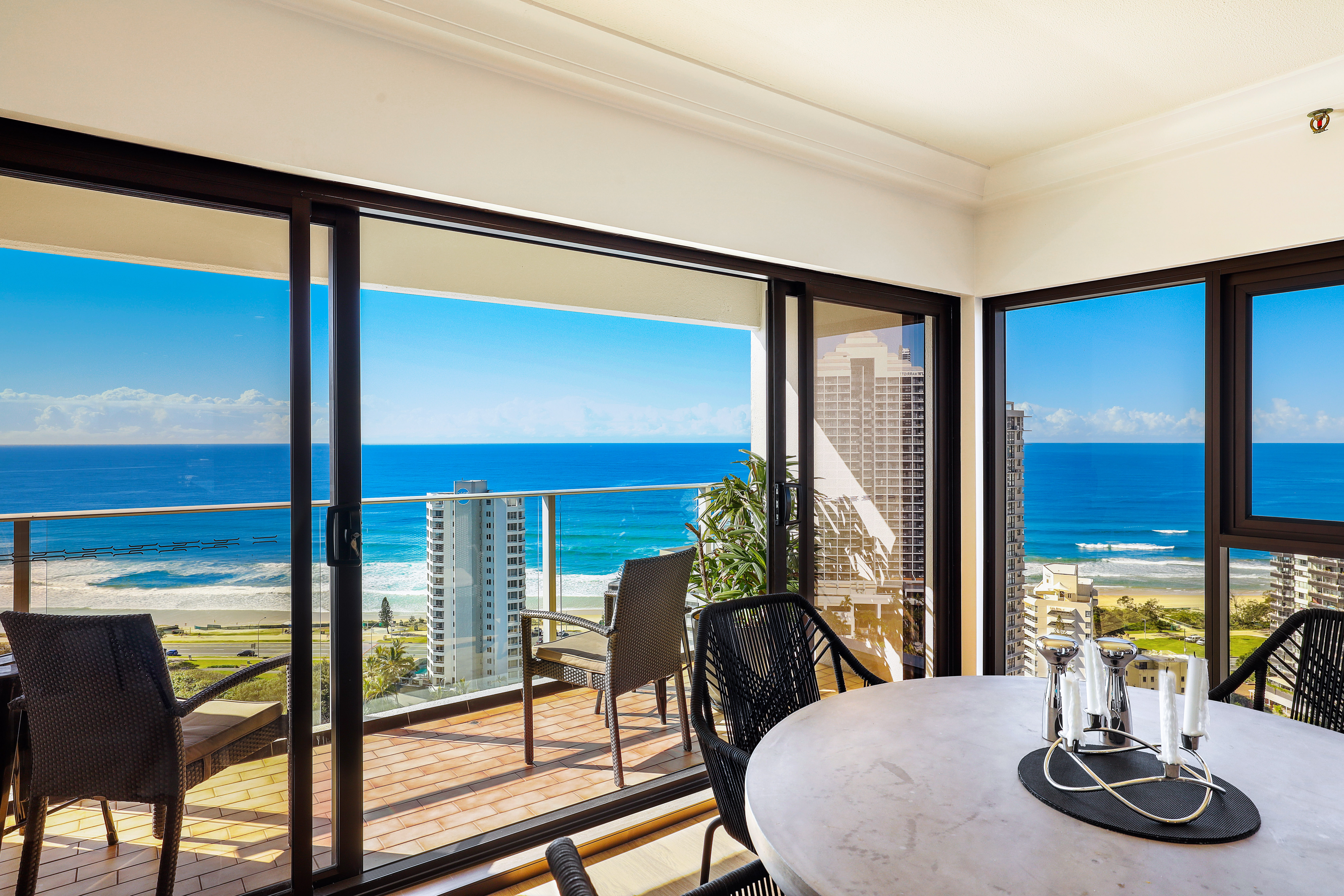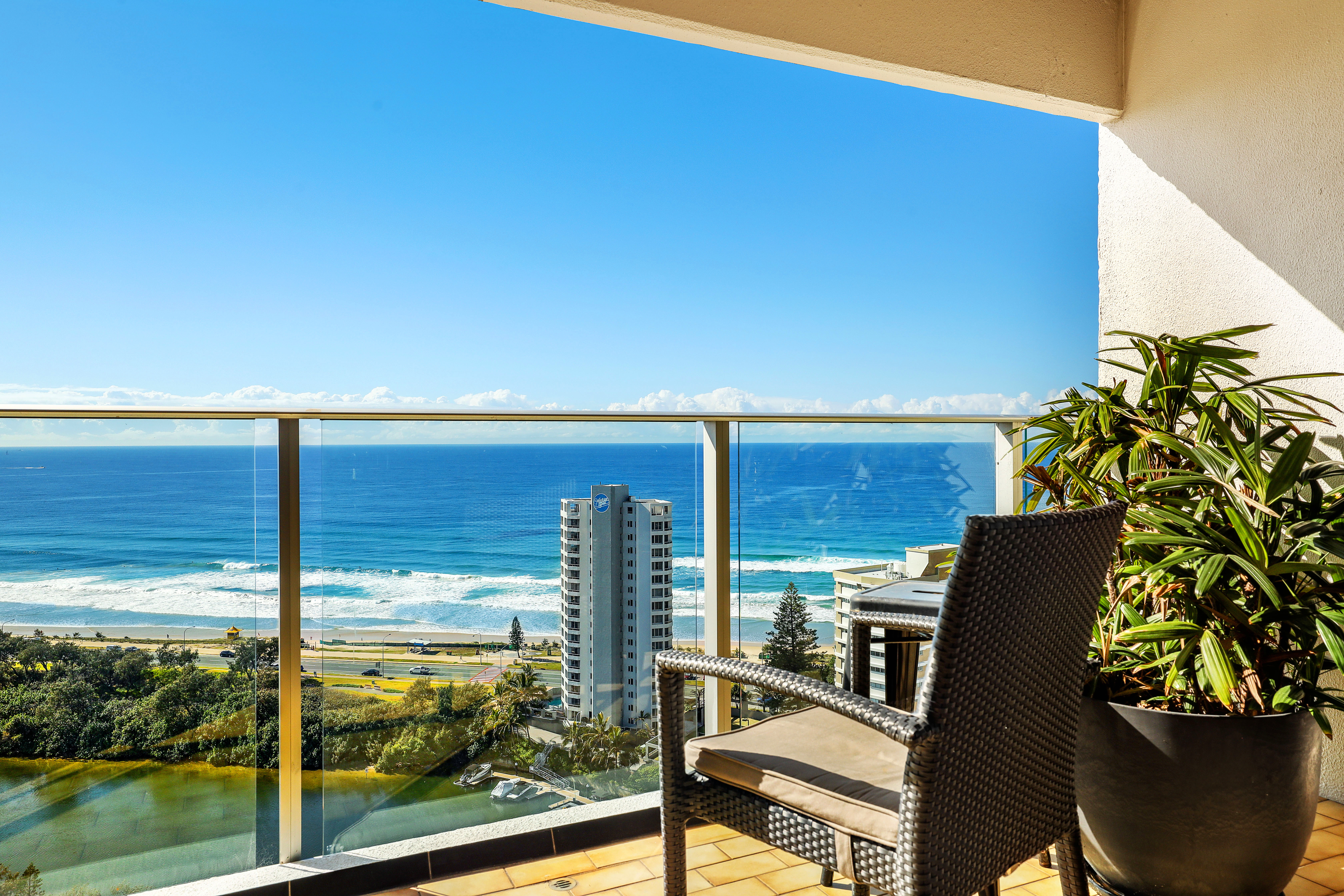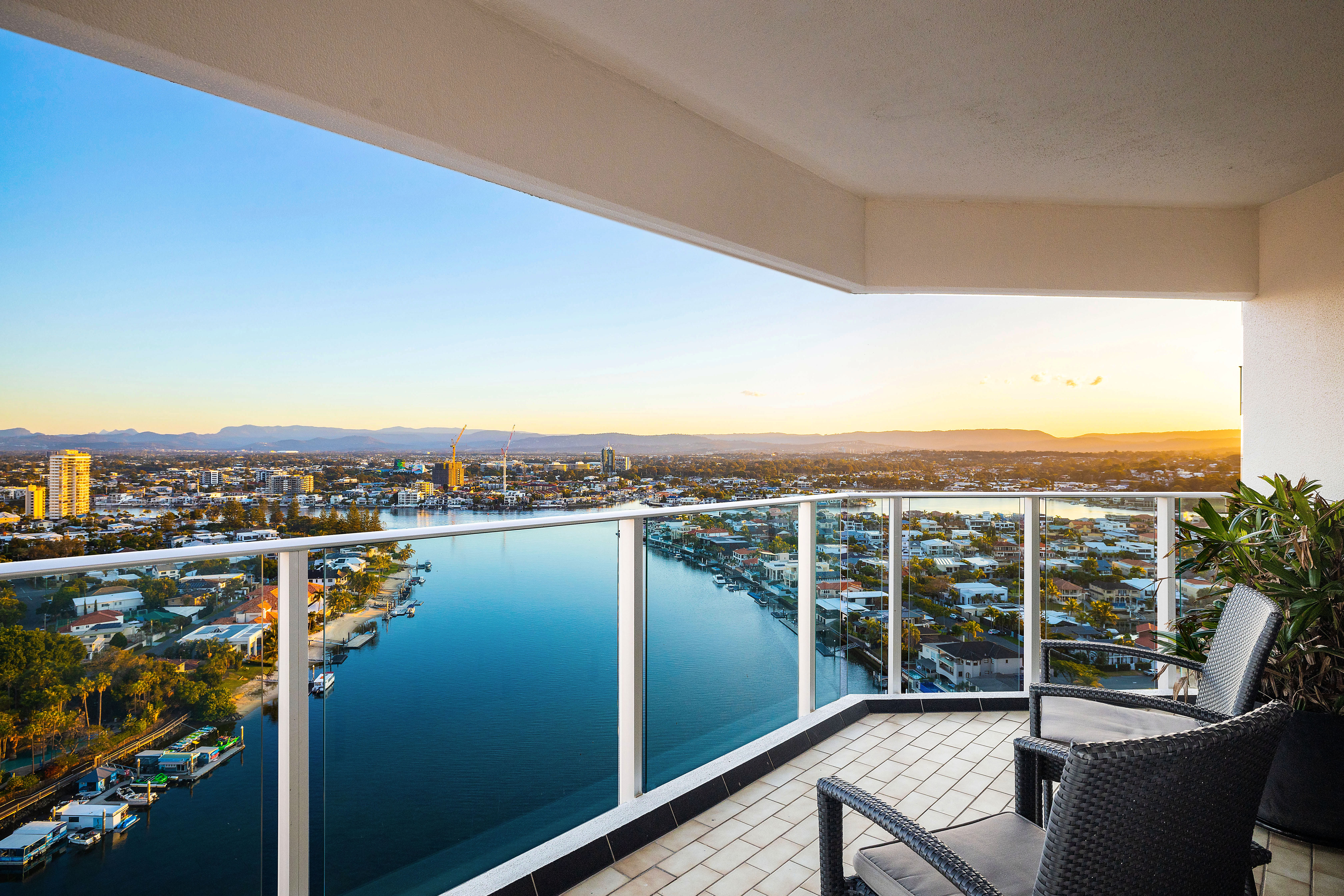 balcony is wide with stunning river, skyline and hinterland views.