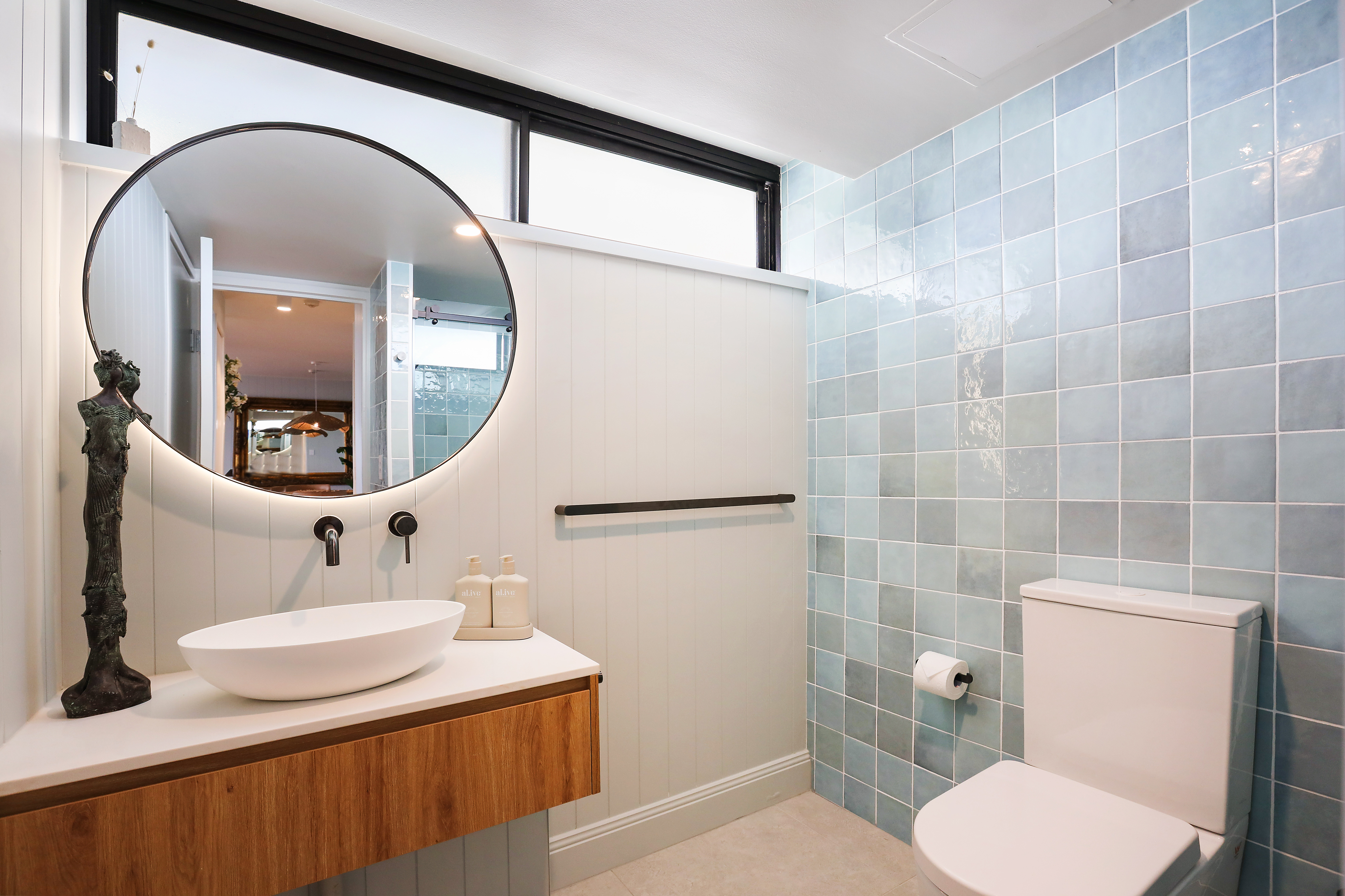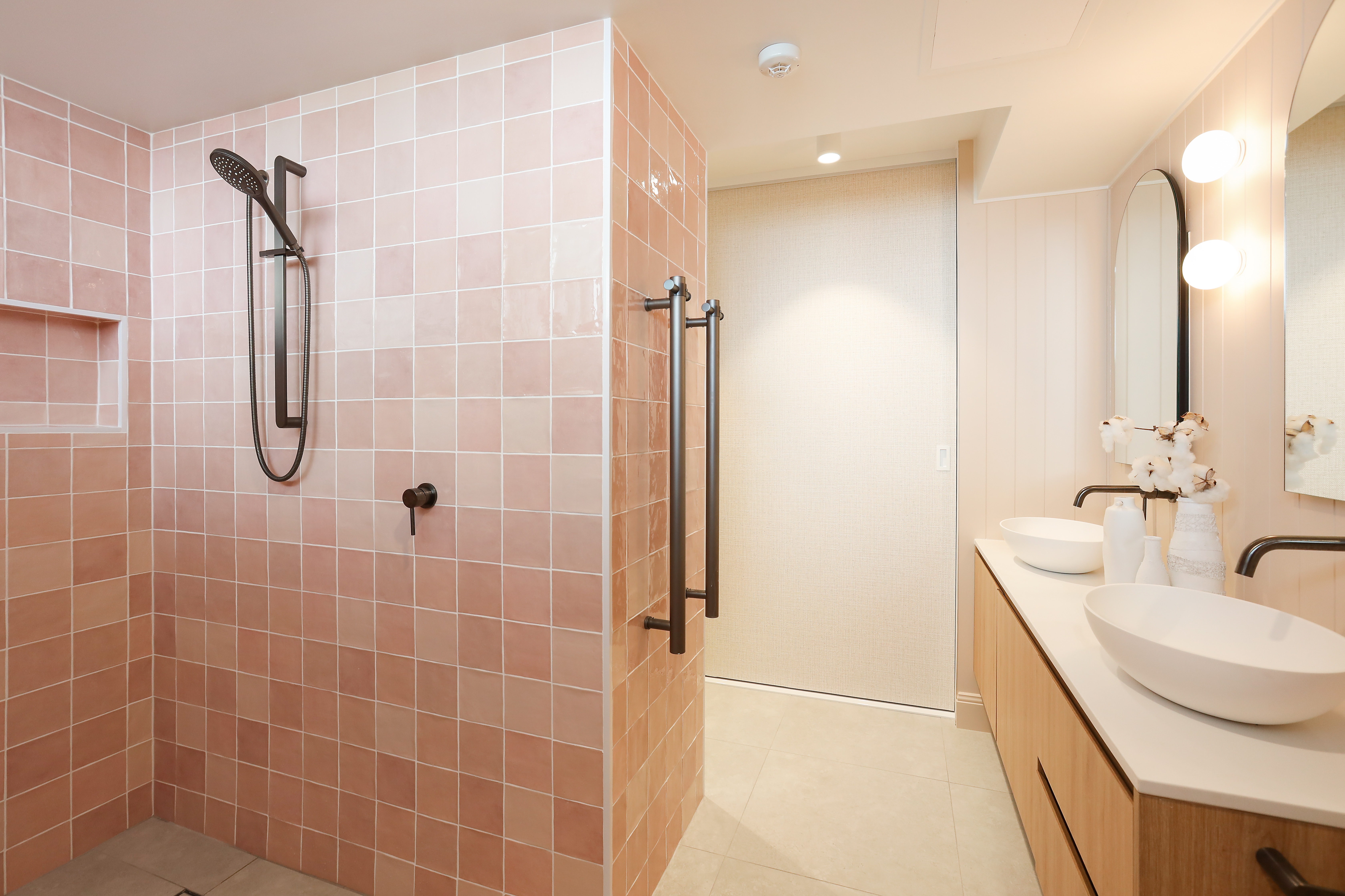 - Ensuite with double vanity, large shower, wall storage mirrors, vertical heated towel rails