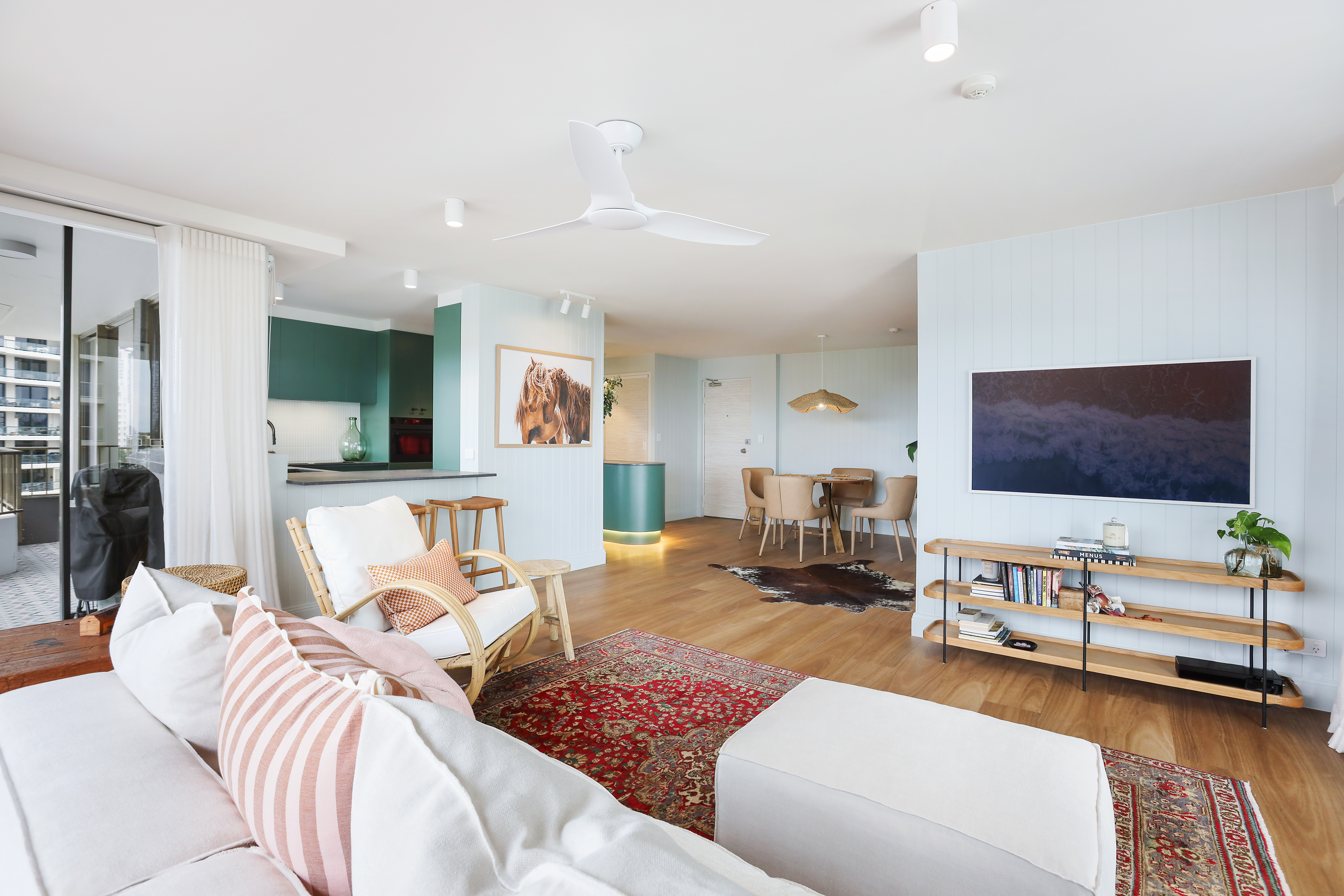 This apartment definitely has the wow factor, renovations are rarely done as meticulously as this. Stone benchtops, leading-edge kitchen appliances, brushed gunmetal fixtures, imported bathroom tiles, curved cabinetry, LED lighting, VJ panelled walls, and full-height sheer Murano linen curtains are just a few of the stunning features.