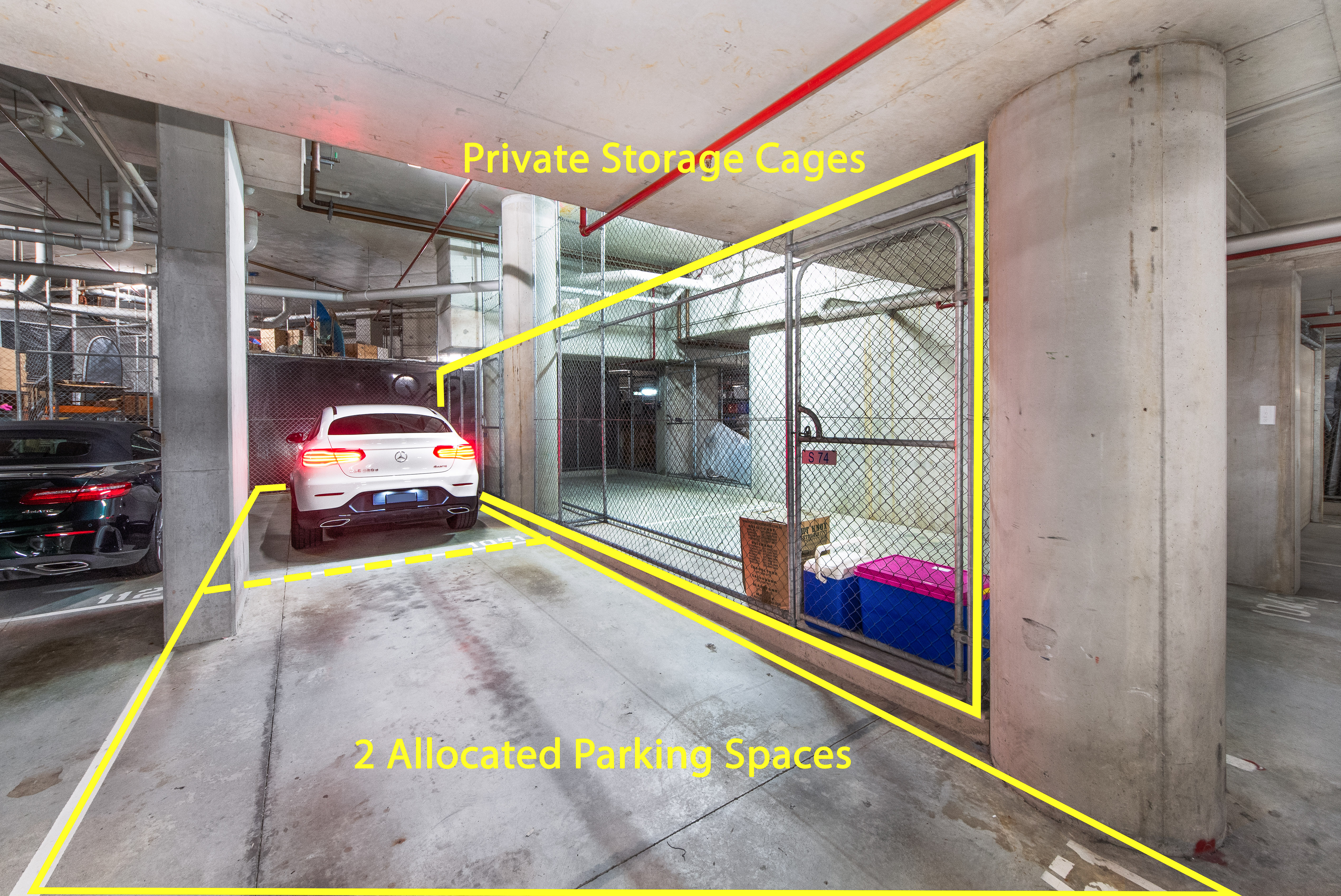 • Extra-large 14m x 5m tandem car park for 2 cars right next to the lifts