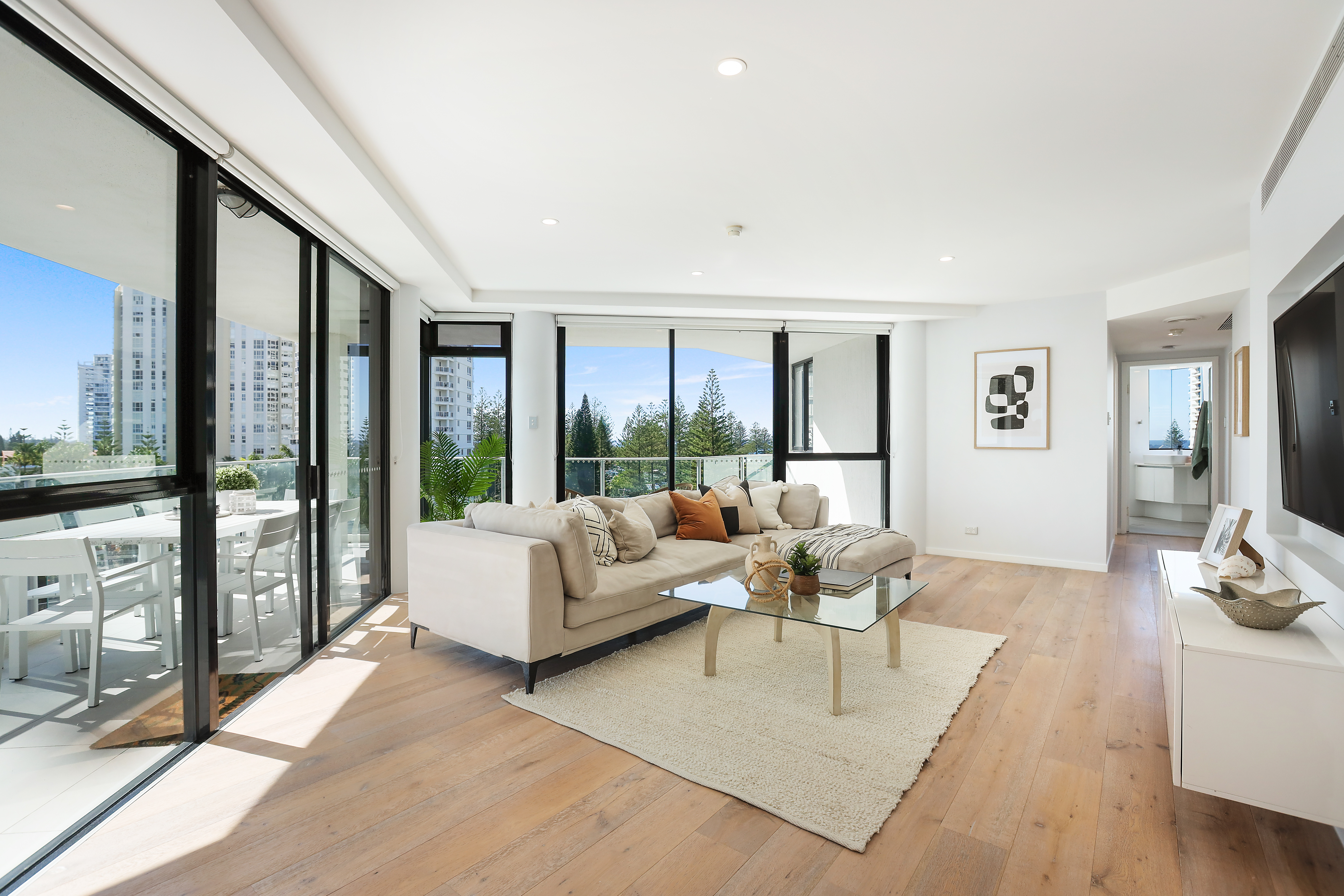 This boutique, residential building in the heart of Main Beach has been designed to take perfect advantage of its location and surroundings. This beautiful apartment has only recently been fully renovated and enjoys a stunning 360° aspect, with hardwood timber flooring and expansive living areas, all flowing seamlessly out to the generous wrap around balconies. No expense has been spared to ensure this apartment is fitted with every modern and stylish convenience.