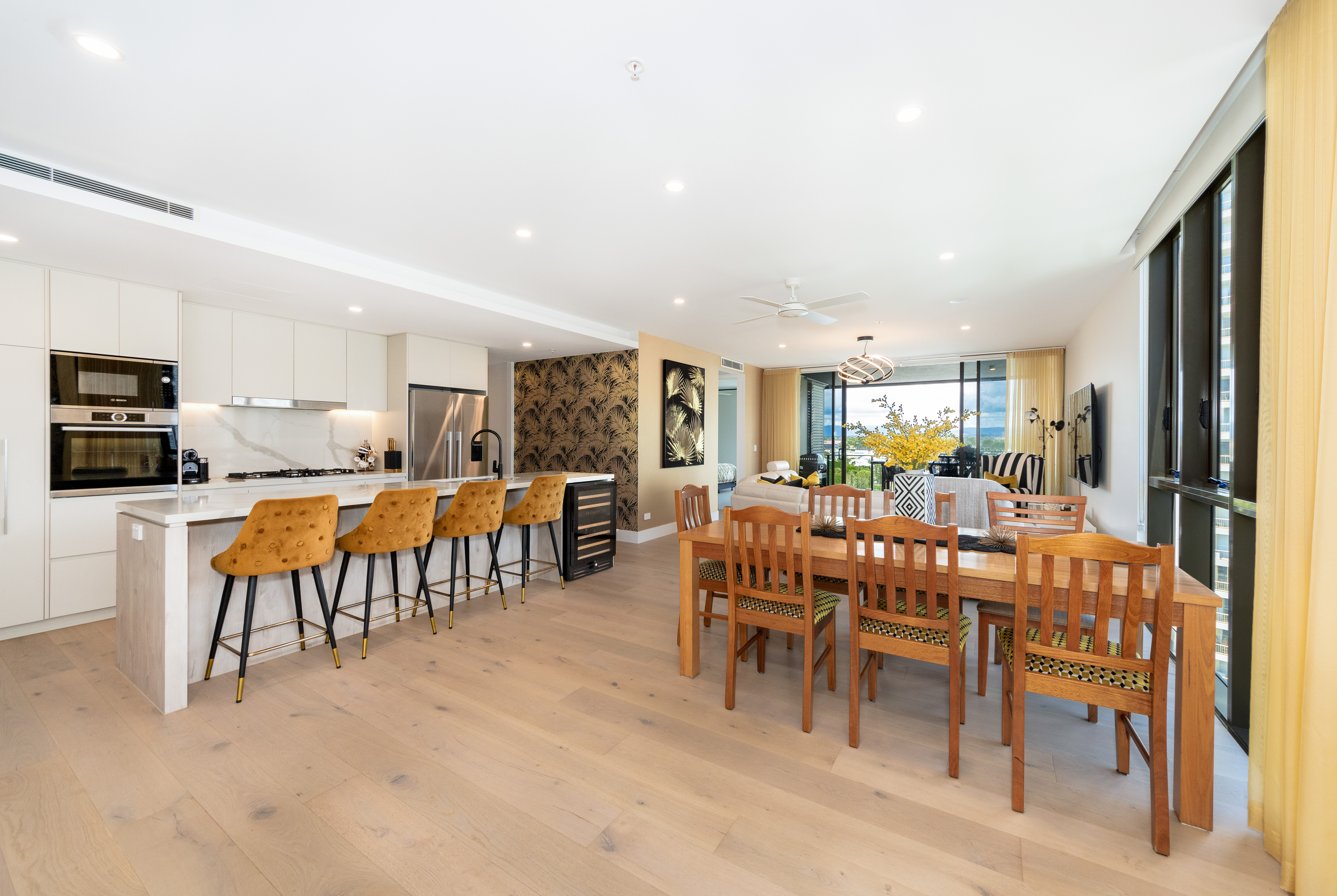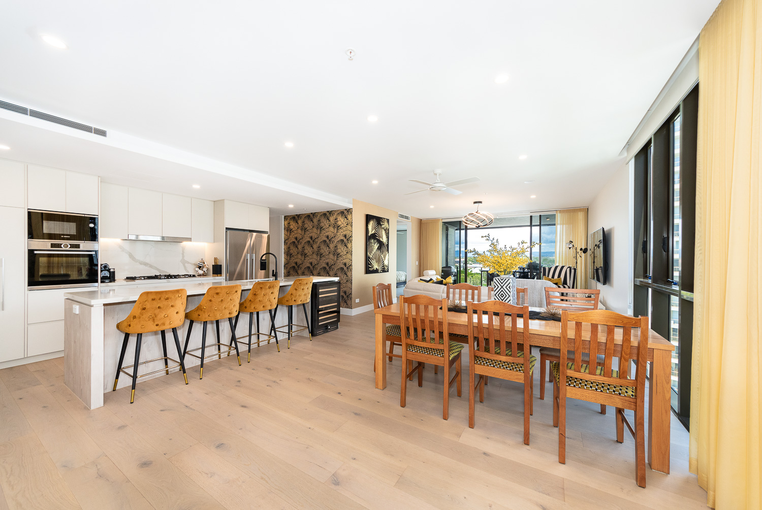 A proper three-bedroom three-bathroom 190m2, light filled apartment with open plan living and plenty of luxurious lifestyle additions awaits you. The kitchen, the heart of the bespoke apartment, offers elaborate stone island benches including extended splashbacks, a large 5 burner jet gas cooktop, built-in wine fridge and State of the Art appliances.