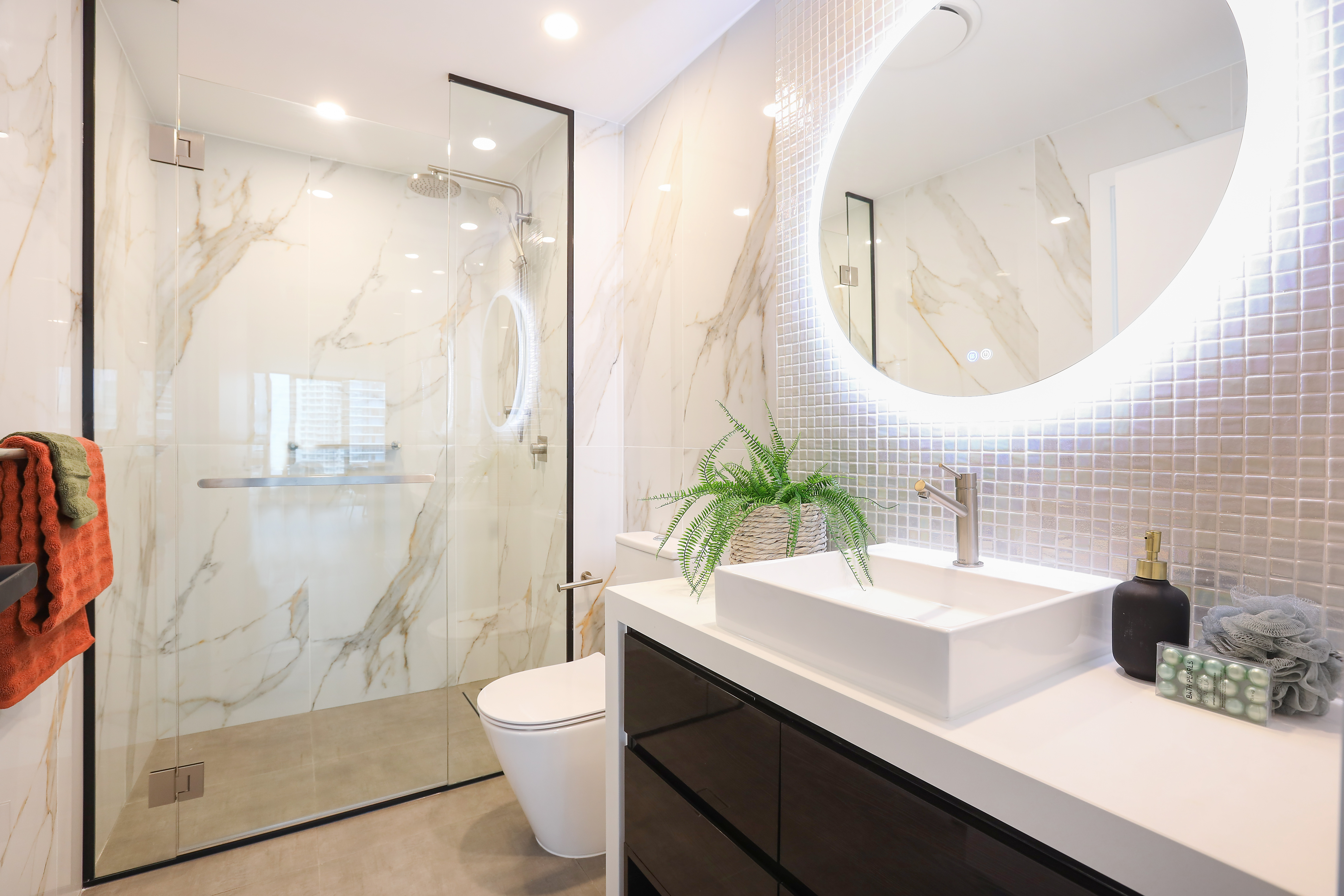 - Bathrooms – stone benches, Frameless glass showers with twin shower heads, LED