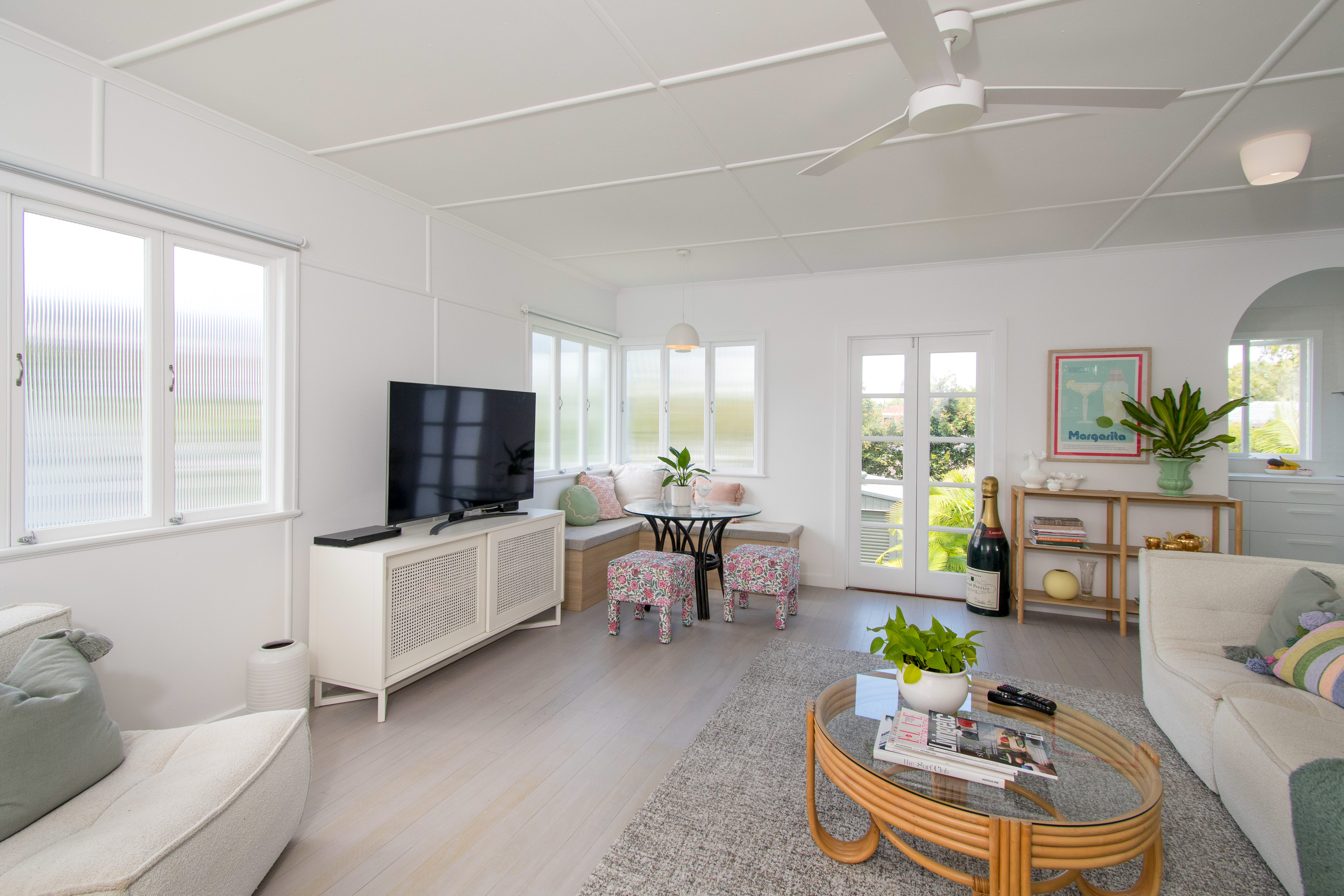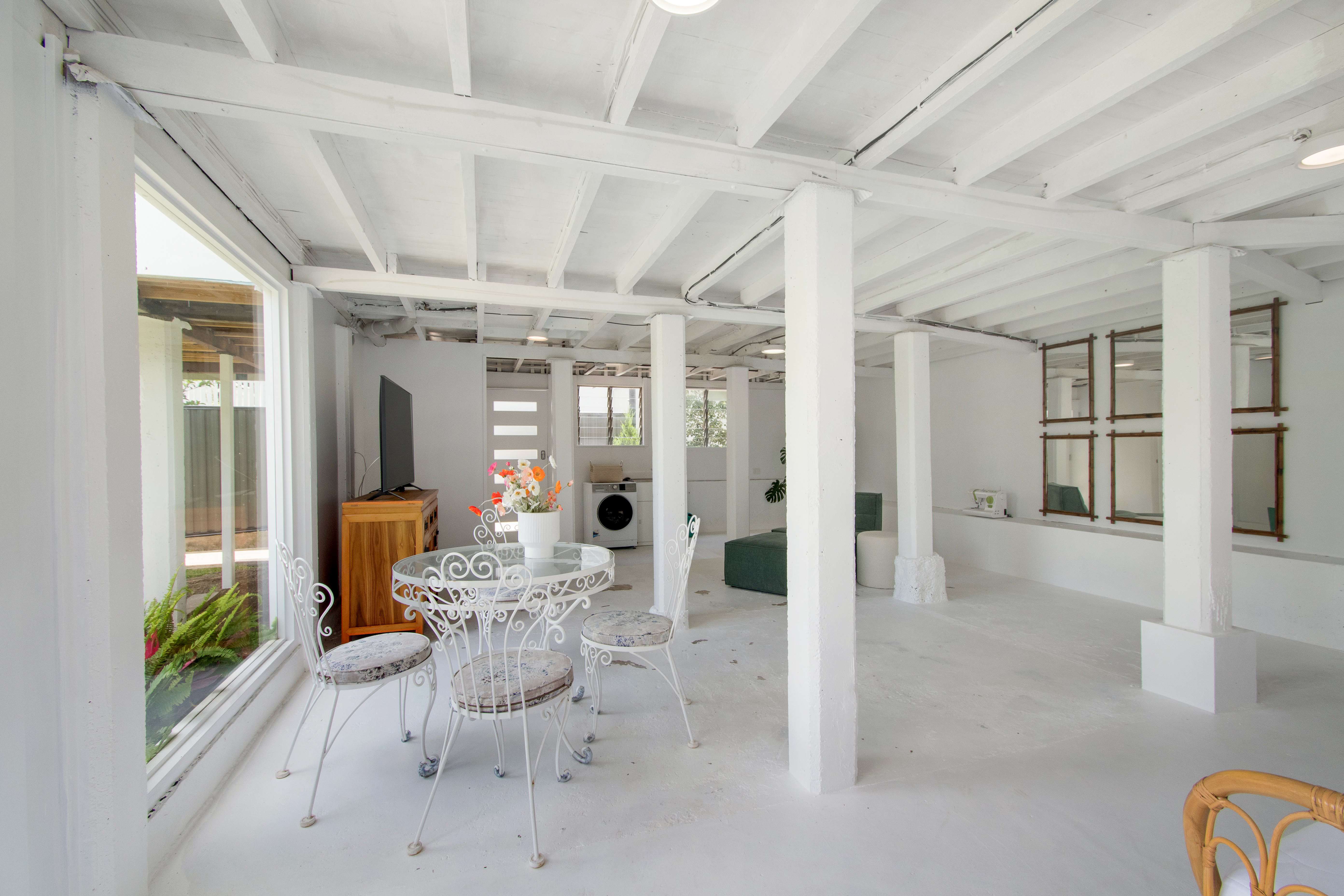 • Open plan living area with extra high ceilings throughout;