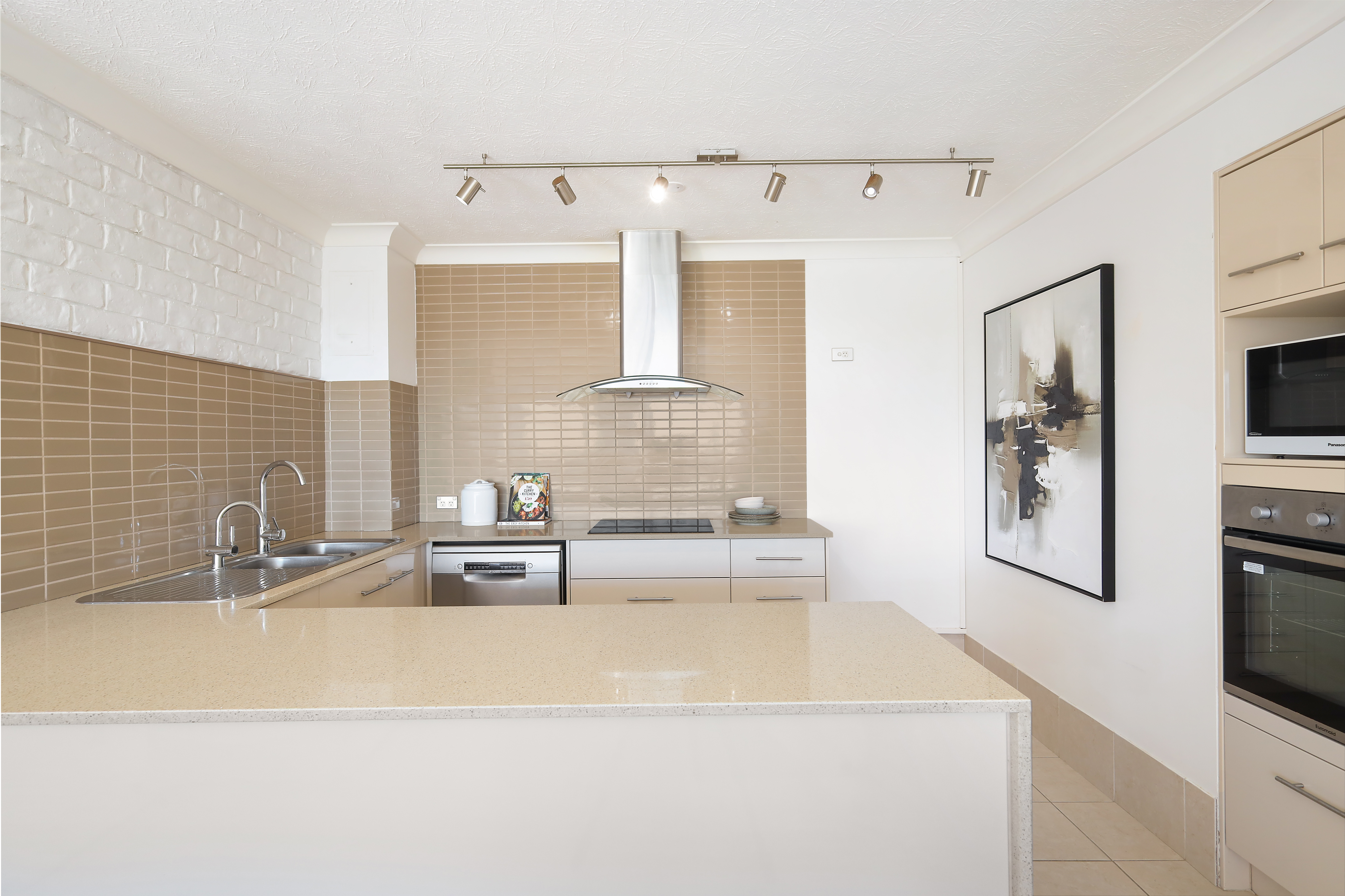 *Modern open plan kitchen with stone benchtops and an abundance of cupboards and storage space